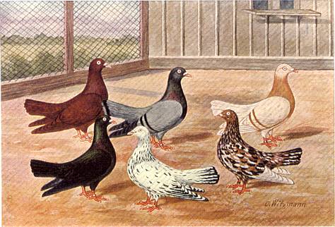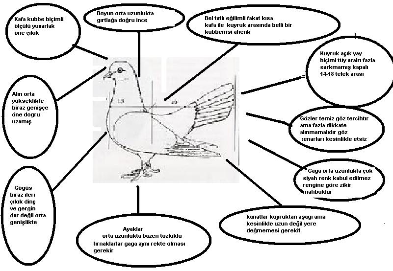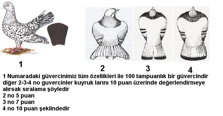 Güvercinlerin Sınıflandırılması Irkların birbirinden ayrılması ile ilgili kriterlerin çok basit farklılıklara dayanması ve yapılan seleksiyon çalışmalarından kısa sürede sonuç alınması nedeniyle 250’nin üzerinde güvercin ırkı sınıflandırılmıştır (Sarıca ve ark. 2003). Güvercinler vücut şekli, büyüklüğü, rengi, kuyruktaki veya kanattaki tüy sayısı, paçalılık, takke, göğüste gül gibi birçok özellik yönünden gruplandırılabilirler. Ancak en kullanışlı sınıflandırma yöntemlerden birisi, kullanım amaçlarına göre sınıflandırmaktır. Kulanım amaçlarına göre güvercinler aşağıdaki gibi sınıflandırılırlar: Dalıcı (Diver): Bu tip güvercinler gökyüzüne yükselir ve bir pırıltı (parıltı) gösterildiği zaman, hemen dalışa geçerler. Aşağıda güvercin sahibinin elinde tuttuğu beyaz renkli bir güvercini, gökyüzündeki güvercine göstermesine halk arasında pırıltı adı verilir. Taklacı (Tumbler): Taklacı güvercinler havada iken öne veya arkaya, peşpeşe belirli sayıda takla atarlar. Taklaların seriliği, sayısı ve atarken yaptıkları diğer hareketlere göre bir güvercinin kalitesi değerlendirilir. Makaracı (Roller): Bu güvercinler takla atmazlar ancak havada bir spiral şekli çizerek, aşağı doğru süzülürler. Dönücü (Spinner): Dönücü güvercinler, makaracı güvercinler gibi havada belirli bir eksen etrafında dönerler ancak yere doğru alçalmazlar. Çember dövücü (Circle flier tumbler): Havada takla atarken aynı zamanda çember şekli çizen güvercin ırkıdır. Filo uçucusu (Fleet flier): Yüksek uçucu güvercinler havada herhangi bir dalma, takla atma, dönme vs. hareketi yapmaz, ancak toplu halde gökyüzünde uçarlar. Yüksek uçucu (High flier): Şahin, kartal, atmaca gibi kuşlardan çekindikleri için, güvercinler genellikle fazla yükselmeyi sevmezler. Bu tip güvercinler tek veya toplu halde çok yükseklere çıkarak, uçuş gösterirler. Güvercinin “havada gözden kaybolması” idealidir. Ancak en azından “toplu iğne başı kadar küçülmesi” beklenir. Posta (Yarış): Bu güvercinlerde herhangi bir vücut şekli, büyüklüğü, rengi ya da ayırıcı özelliğe dikkat edilmez. Sadece hız, dayanıklılık, hedefine varması ve yuvasına geri dönmesi gibi özelliklere dikkat edilir. Posta güvercinleri maraton yarışlarında 1.000 km uçabilir. Süs (Form): Bu güvercinlerin performanslarına dikkat edilmez. Sadece dış görünüş ve güzellikleri için yetiştirilirler. Ötücü: Güvercinlerin ötüşüne “dem çekme” adı verilir. Bu güvercinler ötme yani dem çekme güzelliklerine göre değerlendirilir. Türkiye’de Yetiştirilen Güvercin Tipleri Adana (İngilizce’de Dewlap, Almanca’da Wamnentauben): Dalıcı tip güvercindir. Yerel olarak Cins, Yerli, Töme ve Tartaç olarak da adlandırılırlar. Adana, İçel ve çevresi yetiştirildikleri bölgelerdir (Şekil 1) (Aşkın 2010, Pepedil 2010, Anonim 2010b ). Ağ (Sharabi, Syrian Dewlap): Dalıcı tiptir ve yerel olarak Şarabî olarak adlandırılır. Genellikle Güneydoğu Anadolu Bölgesinde, Suriye sınırına yakın bölgelerde yetiştirilir (Şekil 2) (Anonim 2010b ).
